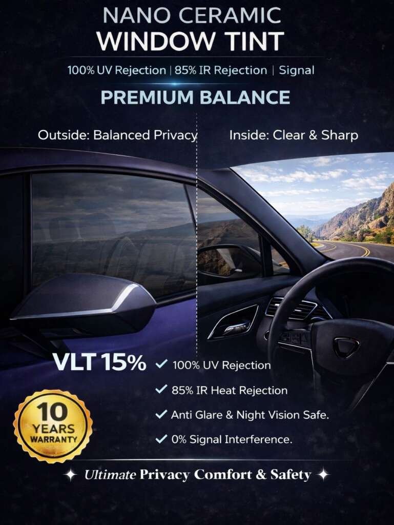 The Premium Balance (15%) Window Film is engineered with a high-performance coating that resists contaminants such as water stains, insects, bird droppings, and road oil. It prevents fading, discoloration, and surface damage caused by UV rays and environmental pollutants, while maintaining a balanced, clear appearance. With excellent durability, it protects vehicle interiors from heat, glare, and minor scratches, ensuring long-lasting performance and comfort.